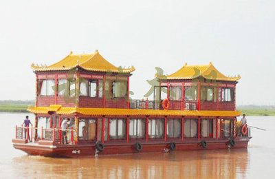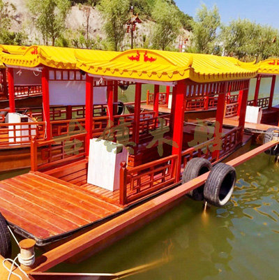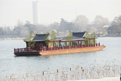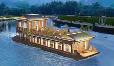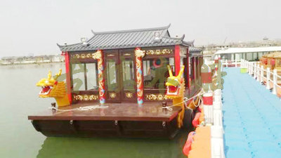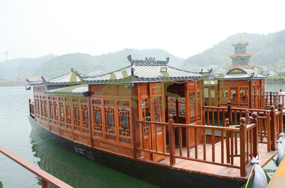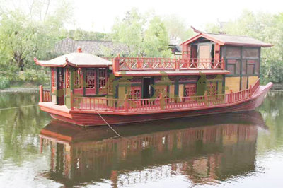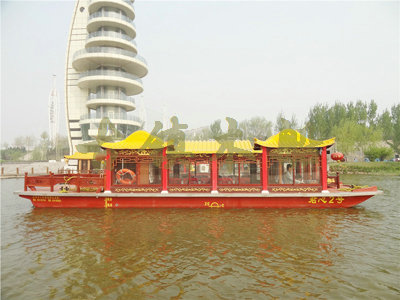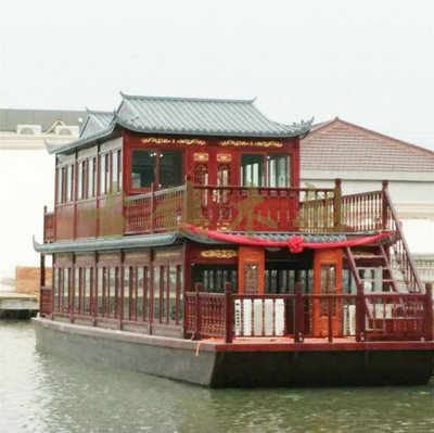 畫舫船就是裝飾古典華麗的游船,是"中國風(fēng)"的仿古游船,結(jié)合古典園林建筑,體現(xiàn)了中華文明的古典藝術(shù).畫舫船豪華而又古典,船上的建筑按照中國古代建筑里的亭臺樓閣,建筑工藝之復(fù)雜,要求之嚴(yán)格,仿古畫舫游船的特點(diǎn)飛檐翹角、玲瓏精致的四角亭子逐漸成形,赫然立于船頭,美人靠、盤龍柱子、彩畫……龍柱上的浮雕盤龍和祥云一層扣著一層,層層錯落有致,雕刻精細(xì)到盤龍身上的每一個鱗片都細(xì)細(xì)可數(shù),古代皇家標(biāo)志性元素,在畫舫船上體現(xiàn)的淋漓盡致。除了雕刻、花窗,整條船還有一個看點(diǎn),那就是弧線優(yōu)美、高高翹起的船尾。游船并不大,長約10米、寬3米,但是整體看起來堪稱一件藝術(shù)品。船尾的雕花欄桿與船艙、船頭的雕刻遙相呼應(yīng),船身四周貼著浮雕祥云,給整條船增添了富貴、華麗的氣質(zhì)。